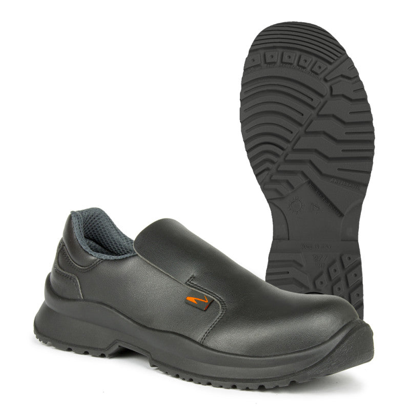Slip-on safety shoe ideal for the food sector; upper made of water-resistant synthetic material. The three-dimensional Spyder-Net breathable lining offers an exceptional comfort keeping the feet always dry. The PU-dual density Solid sole consists of the Esolight 1.0 and Esolight 2.0 compounds: the low-density micro-cells of the Esolight 1.0 increase the energy absorption whereas the Esolight 2.0 of the outsole, with higher density, provides for durability and slip resistance.COMPO200 polymeric toe cap, a-magnetic and light, complying with the European Standard for highest foot protection.